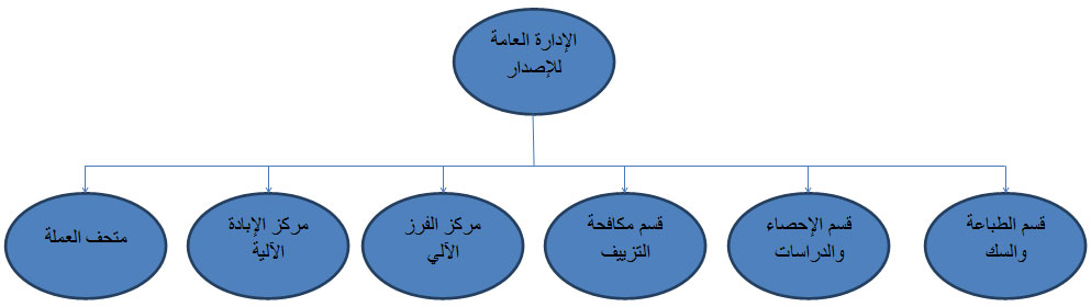وعليه وحتى تضطلع الإدارة بدورها فقد قامت بالإضافة للأقسام الموجودة بها، بإنشاء مركزين أحدهما خاص بفرز العملات والآخر بإبادتها. ويوضح الهيكل التنظيمي الوحدات المكونة للإدارة العامة للإصدار.