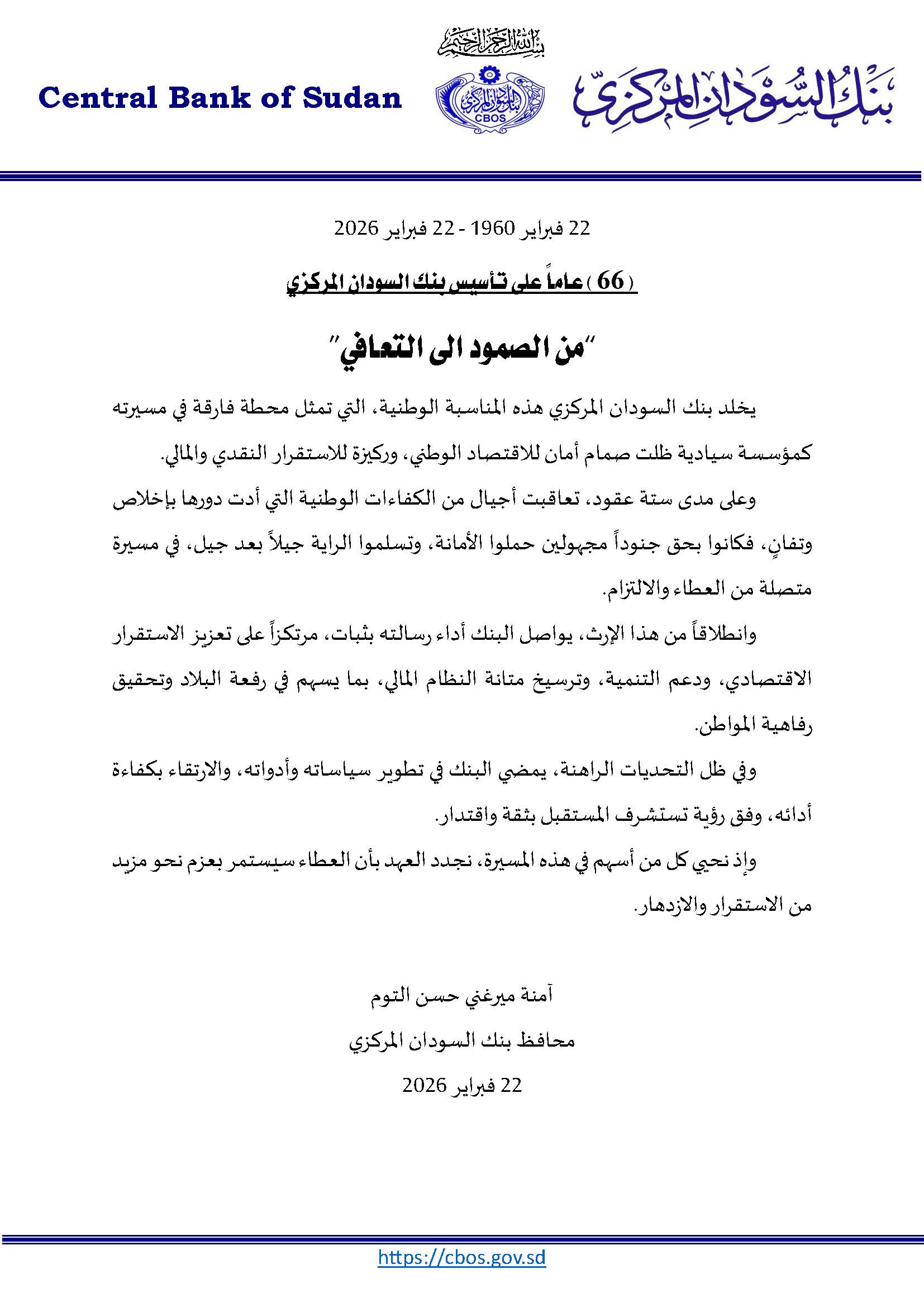 خطاب السيدة محافظ بنك السودان المركزي بمناسبة العيد 66 لتأسيس البنك